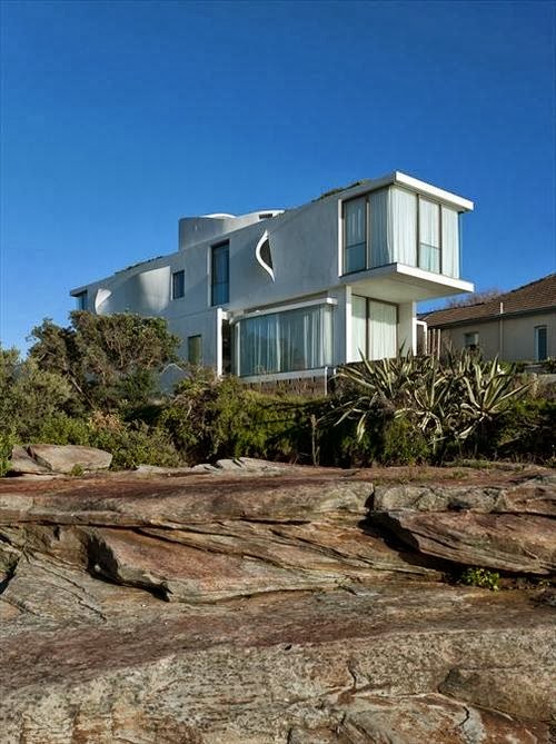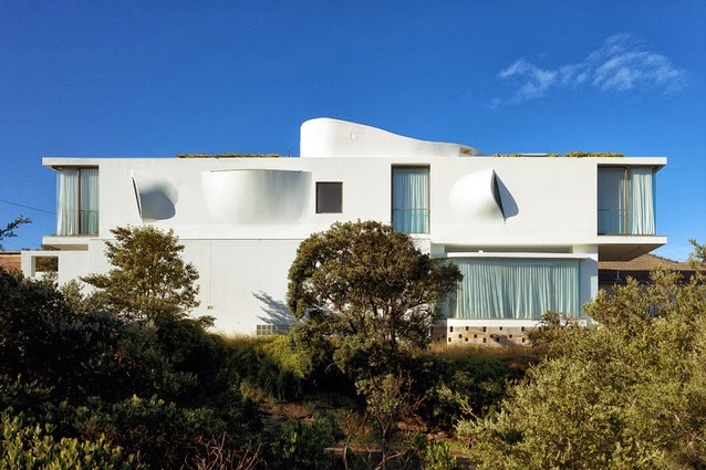 It isn't hard to imagine how impressed the judges must have been when they received Chris Elliott Architects' entry of Seacliff House in the Sydney Design Awards 2013 – the form of the house is as awe-inspiring as the ocean view over which it presides. Built for a family of four on a rocky platform overlooking the sea, the stark white house is both sharply angled and undulating in parts. Inside there is more white, lots of floor-to-ceiling glass windows and a sleek furniture. In some areas however, two features bring fun and warmth to the home: bold colour-blocking around the internal pool and raw hewn sandstone walls in the shower room. Not surprisingly, Seacliff house took out the top awards in both the Residential Architecture and Residential Interior Design categories for the Sydney Design Awards which announced the winners for all categories of design, from Installation Design to Graphic design, at an event held at the Beresford Hotel in Sydney last night. The striking images below are courtesy Chris Elliot Architects and photographer Richard Glover.