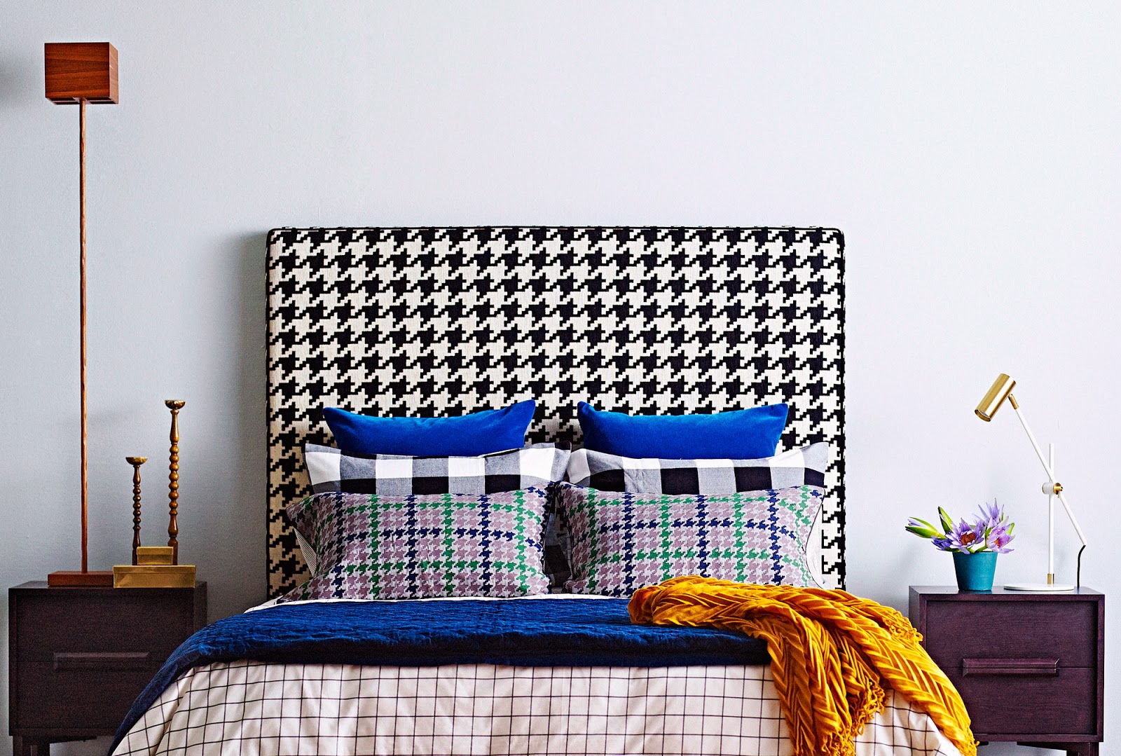 The Ralston Queen bedhead from Heatherly Design Bedheads includes a piped-side profile detail with options of buttoning and contrast piping. Dress the bed in various check patterns to striking effect.